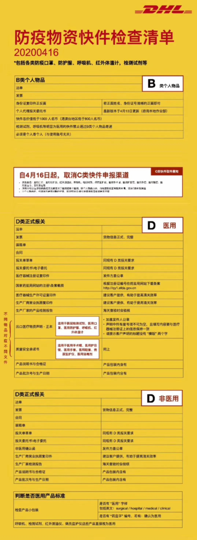 日前,DHL等國際快遞公司相繼宣布,將不再接受醫(yī)用口罩C類(KJ3)報(bào)關(guān)方式出口!必須要走正常的D類一般貿(mào)易報(bào)關(guān)方式。并需提供確認(rèn)函,以防止企業(yè)責(zé)任歸屬、亂報(bào)等問題。