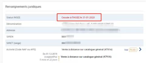 輸入9位siren號查詢,出現紅色信息表示已注銷