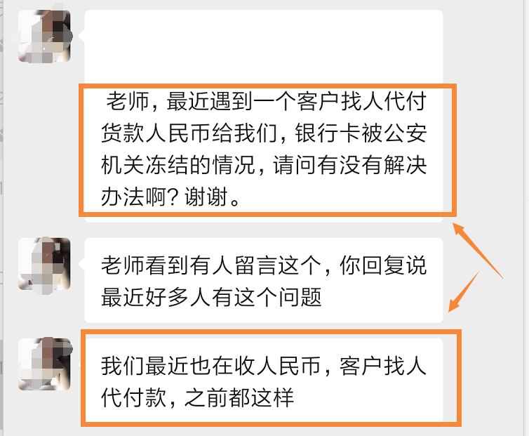 都是反饋,客戶(hù)找人代付人民幣貨款,結(jié)果收到款后賬戶(hù)就被公安機(jī)關(guān)凍結(jié)了。而且很長(zhǎng)時(shí)間也無(wú)法解凍,嚴(yán)重影響正常的貿(mào)易活動(dòng),及企業(yè)經(jīng)營(yíng)和個(gè)人生活。