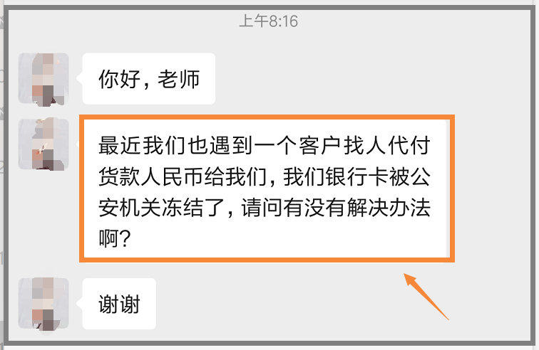 一種情況是,客戶(hù)找人代付人民幣貨款,我們收款。收款后發(fā)現(xiàn)賬戶(hù)或銀行卡被公安機(jī)關(guān)凍結(jié)了。