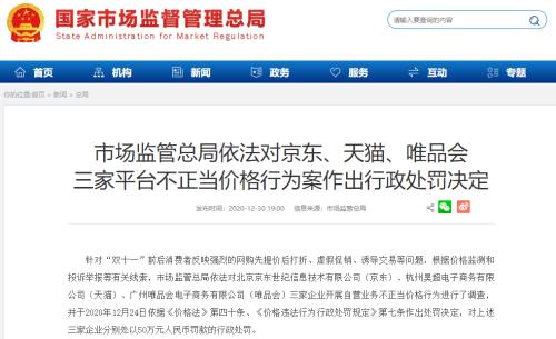 12月30日晚,國家市場(chǎng)監(jiān)管總局公布多份行政處罰決定書,京東、天貓、唯品會(huì)三家電商平臺(tái)均因不正當(dāng)價(jià)格問題,被罰50萬元。