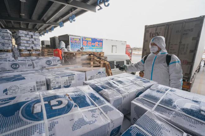 在武漢萬(wàn)噸·華中冷鏈港,工作人員對(duì)進(jìn)口冷鏈?zhǔn)称愤M(jìn)行消殺。熊琦攝(新華社)