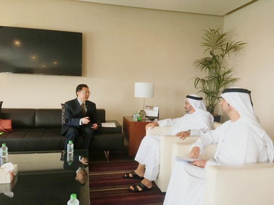 2019年6月23日,駐阿聯(lián)酋大使倪堅(jiān)會(huì)見阿聯(lián)酋外交與國際合作部政治事務(wù)部長(zhǎng)助理哈利法,東亞與太平洋司司長(zhǎng)艾哈邁德會(huì)見時(shí)在座。