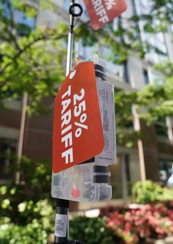 (6月17日,在美國(guó)華盛頓,一支魚(yú)竿上掛著抗議加征關(guān)稅的標(biāo)語(yǔ))