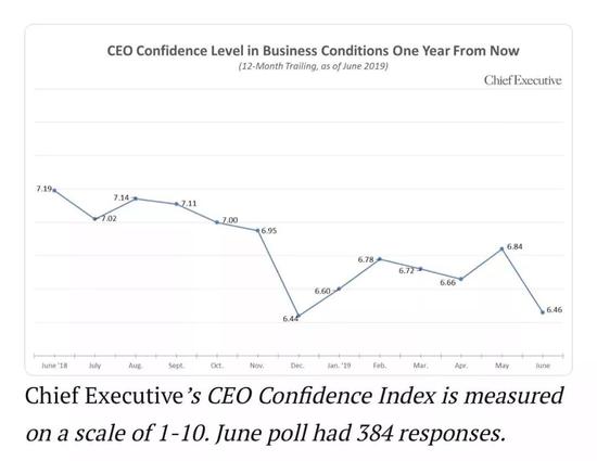 數(shù)據(jù)顯示,受到美國(guó)政府關(guān)稅和貿(mào)易政策的影響,美國(guó)企業(yè)CEO信心指數(shù)在下降,與去年同期相比,企業(yè)CEO信心下降了10%,而今年5月中美貿(mào)易磋商未果,也導(dǎo)致了6月份企業(yè)CEO信心指數(shù)猛跌。
