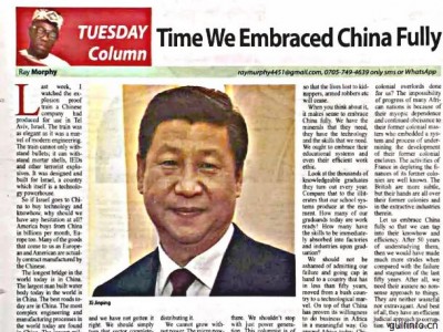14日,尼日利亞主流媒體《領(lǐng)導(dǎo)者報》 使用整版封底刊登專欄文章“全面擁抱中國時不我待”,積極評價中國在各領(lǐng)域取得的全方位成就,呼吁尼各界主動學習中國,積極擁抱中國資金、中國技